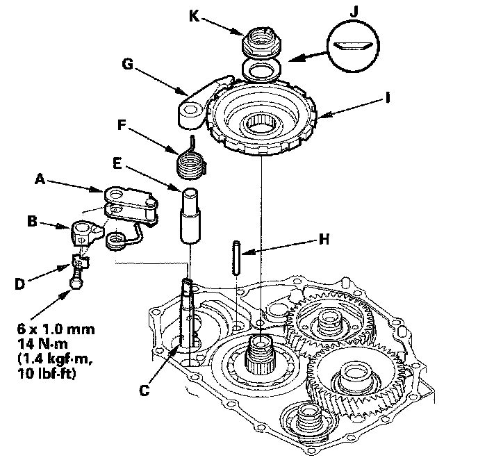 7. Install the park gear (I), old conical spring washer (J), and old locknut (K) on the countershaft.