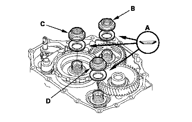 11. Install the new conical spring washers (A) in the direction shown, and install the new mainshaft locknut (B), the new countershaft locknut (C), and the new secondary shaft locknut (D).