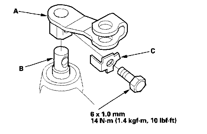 15. Install the control lever (A) on the control shaft (B), and install the bolt with the new lock washer (C), then bend the lock tab of the lock washer against the bolt head.