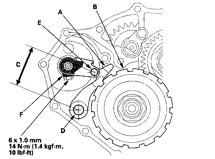 23. Align the cutouts (A) on the rotary-frame with the neutral positioning cutouts (B) on the transmission range switch (C), then put a 2.0 mm (0.08 inch) feeler gauge blade (D) in the cutouts to hold in the N position.