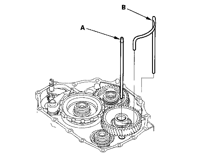 19. Install the ATF feed pipe (A) into the idler gear shaft, and install the ATF lubrication pipe (B) into the transmission housing.