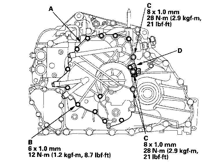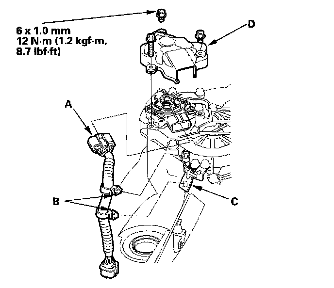 34. Install the ATF cooler inlet line (A) with the new sealing washers (B), and install the bracket (C) of the ATF cooler inlet line on the shift solenoid valve cover hole (D) (described in step 22 in Shaft Assemblies and ATF Strainer Installation.