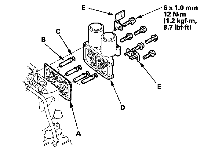 33. Install the A/T clutch pressure control solenoid valves B and C (D) and harness clamp brackets (E).