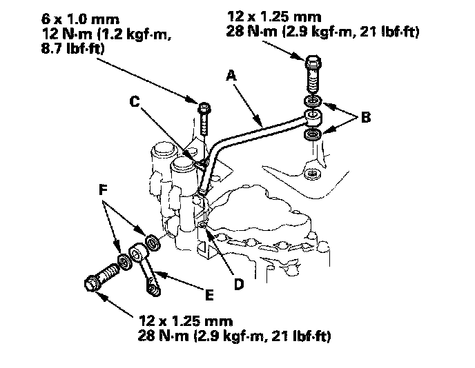 35. Install the ATF cooler outlet line (E) with the new sealing washers (F).