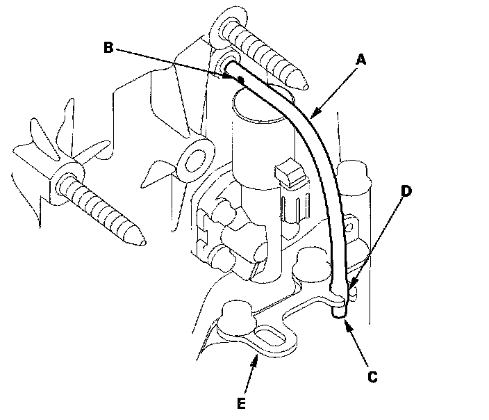 36. Install the breather tube (A) with the dot (B) on the tube facing rearward, then install the other end (C) in the slot (D) of the transmission hanger (E).