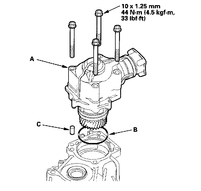 37. 4WD model: Install the transfer assembly (A) with the new O-ring (B) and dowel pin (C).