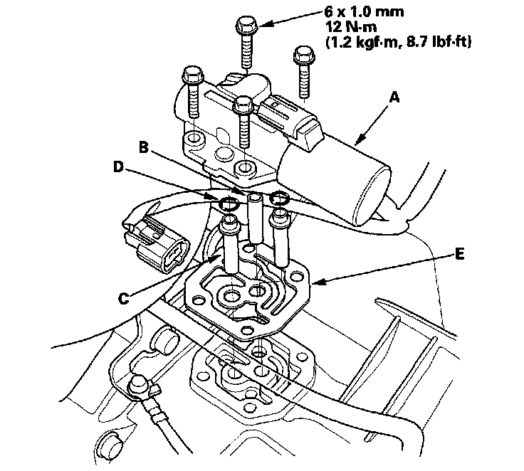 4. Remove the ATF pipe (B), ATF joint pipes (C), O-rings (D), and gasket (E).
