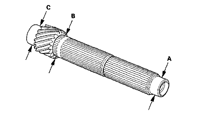 1. Inspect the gear surface and bearing surface for wear and damage, then measure the countershaft at points A, B, and C. If any part of the countershaft is less than the service limit, replace it with a new one.