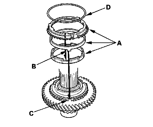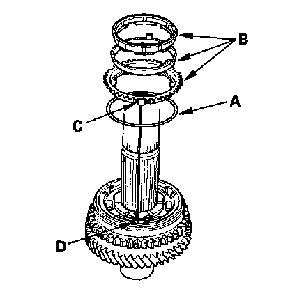 3. Install the triple cone synchro assembly (A) by aligning the synchro cone fingers (B) with 1st gear grooves (C), then install the synchro spring (D).