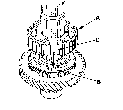 10. Install 2nd gear (A) by aligning the synchro cone fingers (B) with the 2nd gear grooves (C).