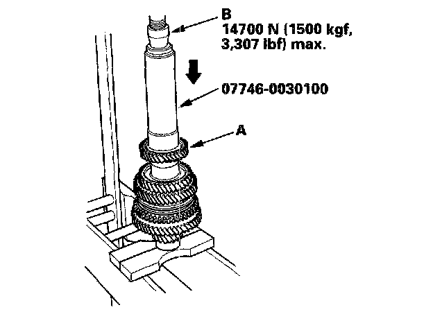 13. Install 5th gear (A) using the special tool and a press (B). Do not exceed the maximum pressure.