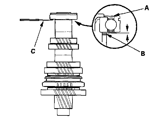 15. Measure the clearance between the old bearing (A) and the 35 mm shim (B) with a feeler gauge (C).