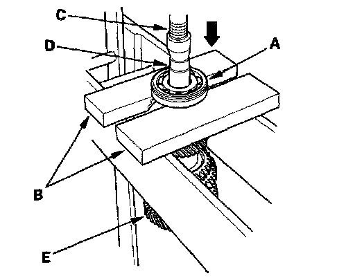 5. Support 4th gear (A) on steel blocks (B), then use a press (C) and an attachment (D) to press the countershaft (E) out of 5th gear.