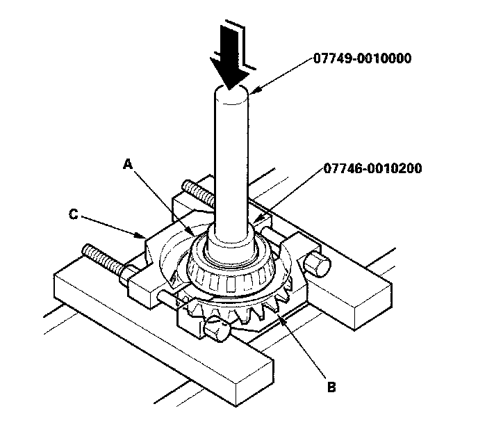 1. Remove the tapered roller bearing (A) from the transfer drive gear (B) with the special tools, bearing separator (C) and a press.