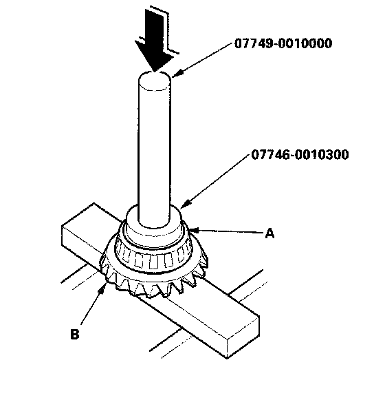 2. Install the new tapered roller bearing (A) on the transfer drive gear (B) with the special tools and a press.