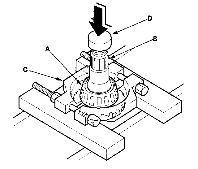 1. Remove the tapered roller bearing (A) from the transfer output shaft (B) with a bearing separator (C) and a press. Place a shaft protector (D) between the transfer output shaft and the press to prevent damaging the transfer output shaft.