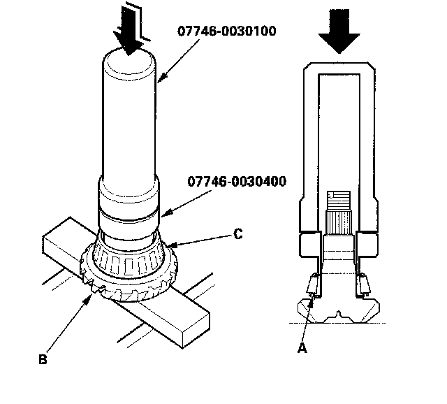 3. Install the tapered roller bearing (C) on the transfer output shaft with the special tools and a press.