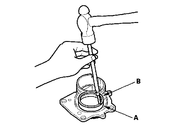 1. Remove the tapered roller bearing outer race (A) and 76 mm thrust shim (B) from the transfer holder.