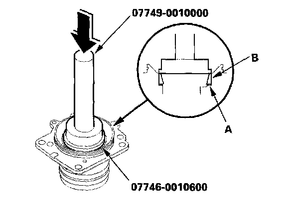 3. Install the tapered roller bearing outer race (B) using the special tools and a press.