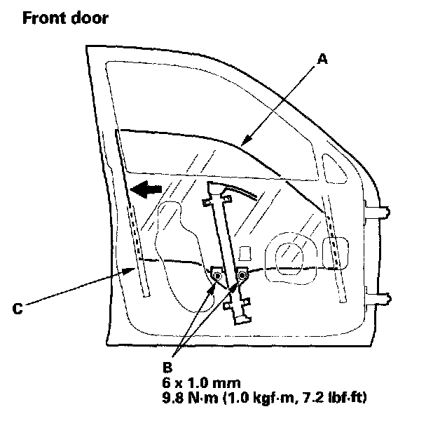 6. Raise the glass fully, and check for gaps. Also check that the glass (A) contacts the glass run channel (B) evenly.