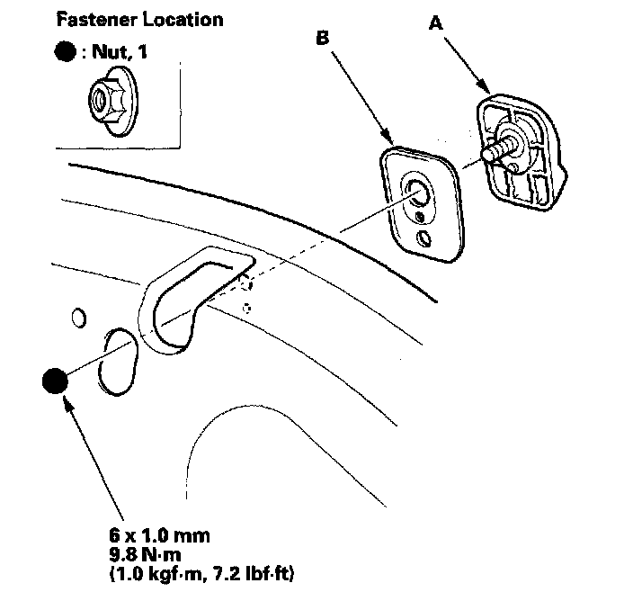 2. Remove the nut from inside the tailgate, then remove the rear window wiper lifter (A) and the seal (B).