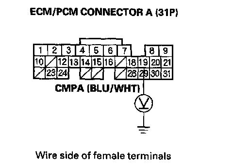 11. Measure voltage between ECM/PCM connector terminal A19 and body ground.