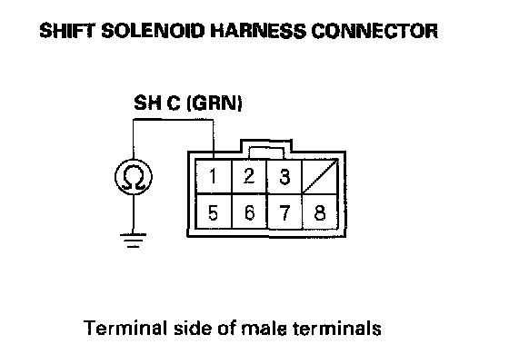 12. Measure the resistance between shift solenoid harness connector terminal No. 1 and body ground.