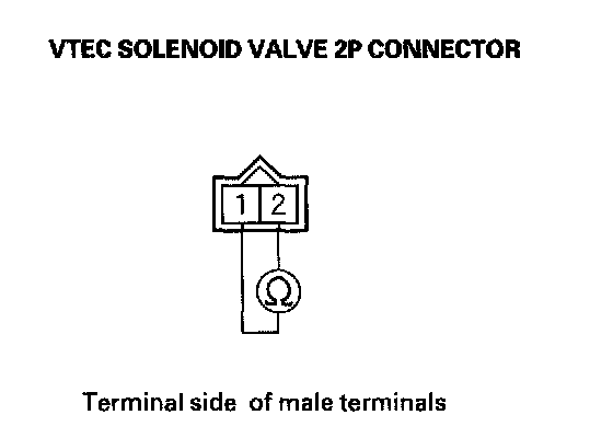 7. Measure resistance between VTEC solenoid valve 2P connector terminals No.1 and No.2.