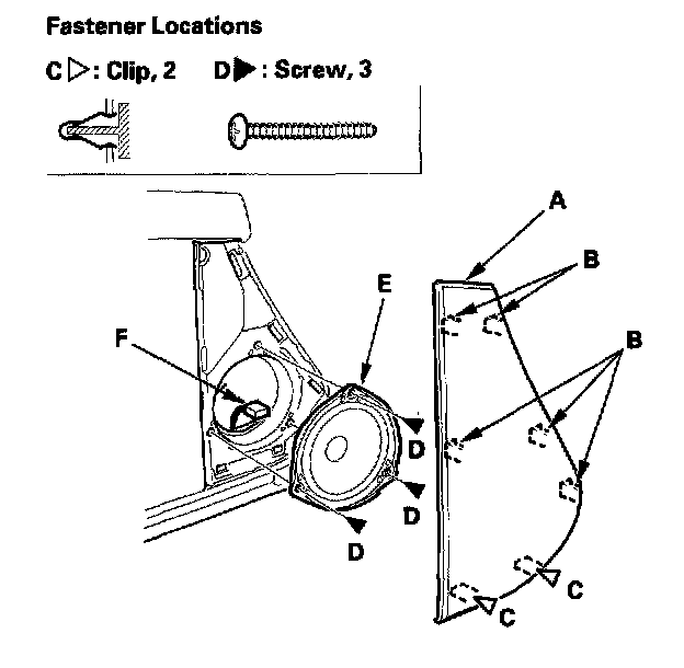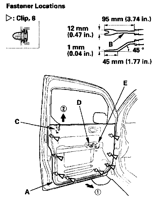 1. Release the clips that hold the door panel with a commercially available trim pad remover (B).