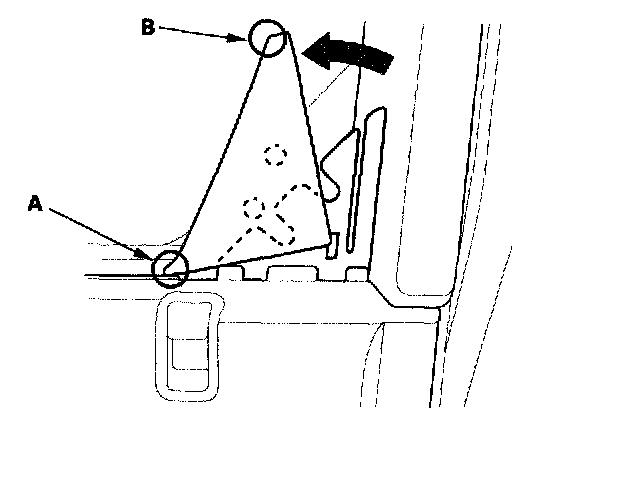 8. Use a trim tool (B) to release the clip at the lower rear corner of the sash trim. Pry out from the edge of the sash trim until the clip releases.