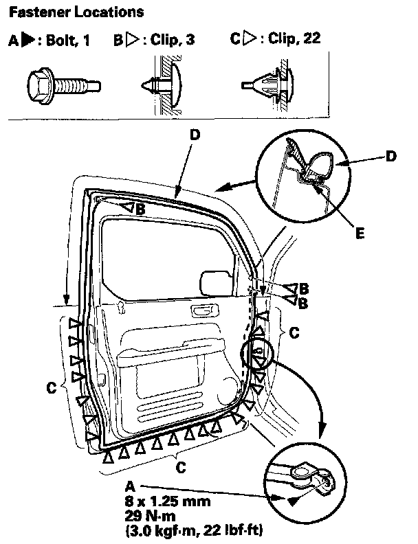 - Make sure the weatherstrip is installed in the holder (E) securely.