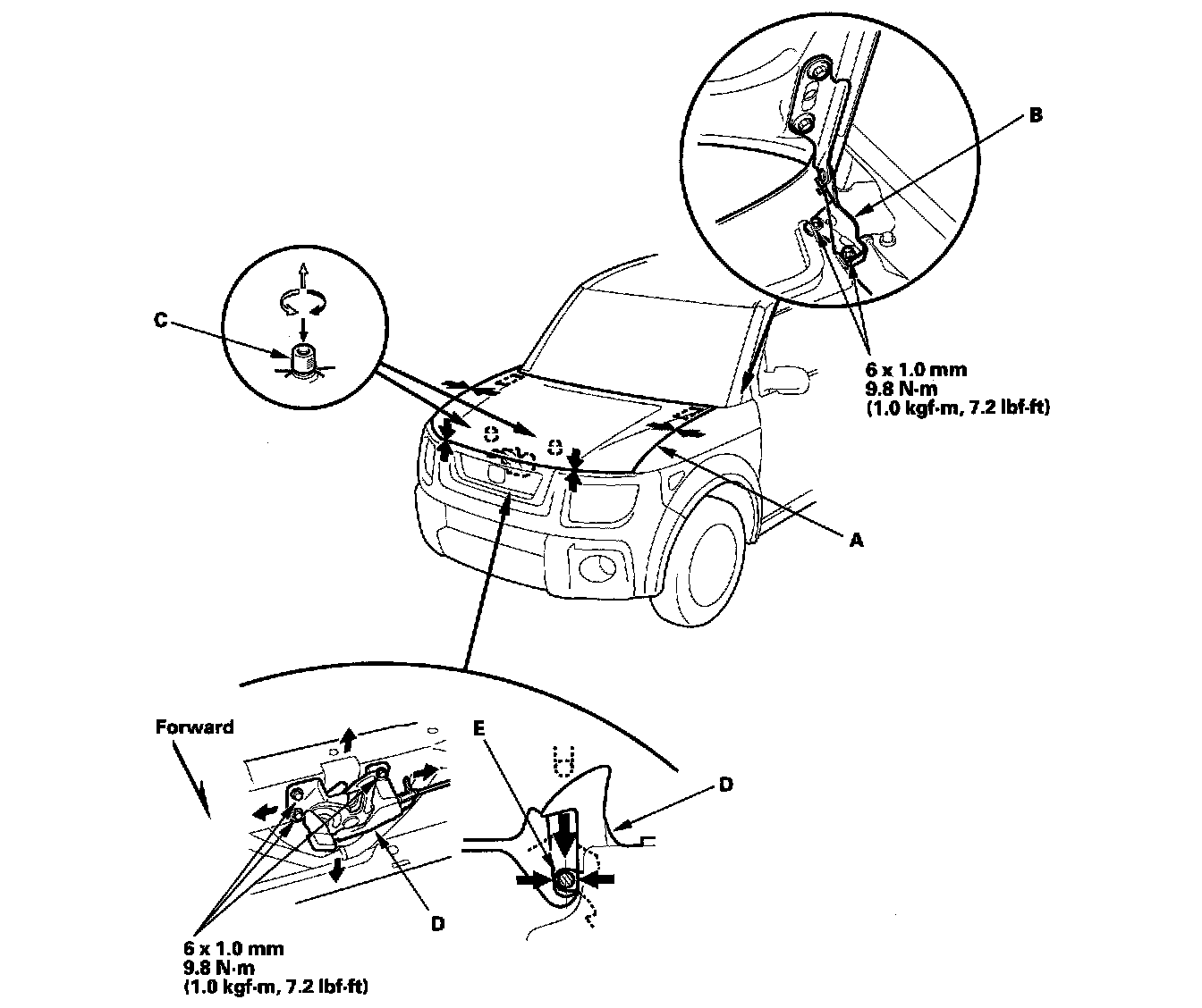 4. Adjust the hood latch (D) to obtain the proper height at the forward edge, and move the hood latch right or left until the striker (E) is centered in the hood latch.