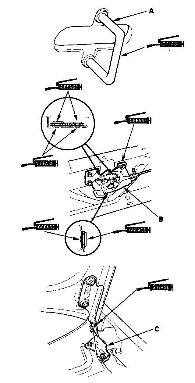 8. Apply multipurpose grease to the hood striker (A), hood latch (B), and hood hinge (C) as indicated by the arrows.