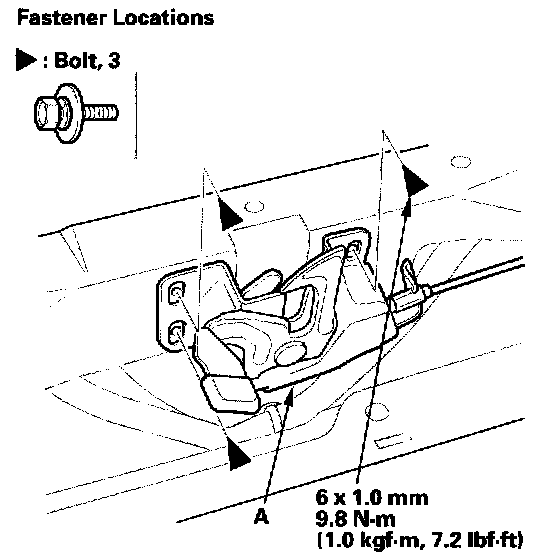 2. Remove the bolts, then remove the hood latch (A) from the body.