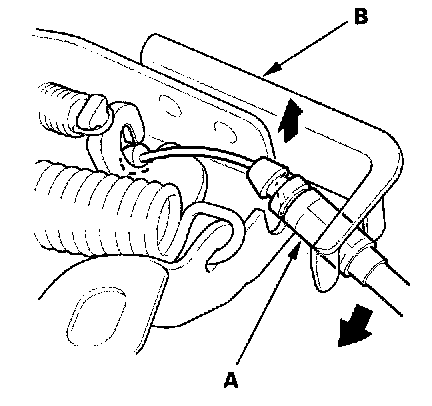 3. Disconnect the hood opener cable (A) from the hood latch (B). Take care not to bend the cable.