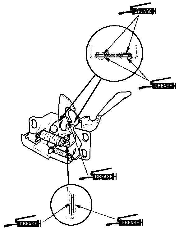 - Apply multipurpose grease to the location of the hood latch indicated by the arrows.