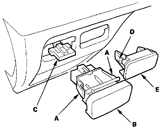 1. Reach under the dashboard, and push on lock tabs (A) to release the cruise control main switch (B), then remove the switch and disconnect the connector (C).