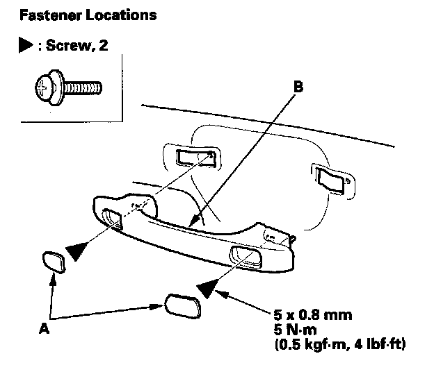 4. On the front passenger's side: Remove the caps (A), and remove the screws, then remove the grab handle (B).