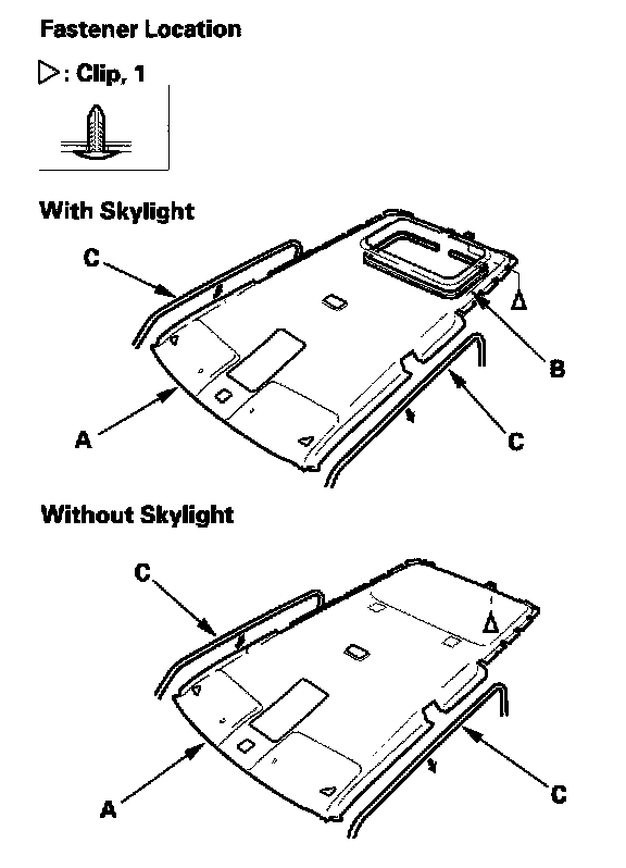 7. If equipped with a skylight, remove the screws, and slide the glass latch handle trim (A) forward to release the hook (B), then remove the trim.