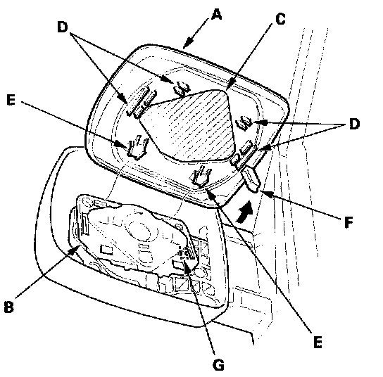 2. Separate the mirror holder from the actuator (B) by slowly pulling them apart while separating the adhesive (C), detaching the clips (D), and releasing the hooks (E). Manual mirror: Release the pin (F) from the pin spring (G).