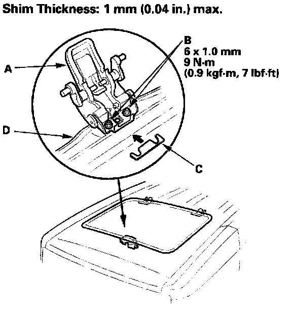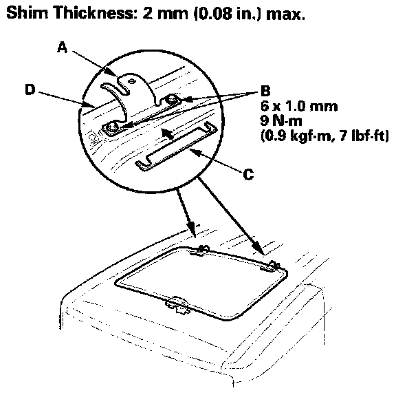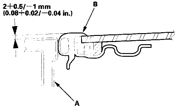 Glass Height AdjustmentThe roof panel (A) should be even with the glass weatherstrip (B), to within 2+0.5/-1 mm (0.08+0.02/-0.04 in) at the center of the glass opening. If not, make the following adjustment: