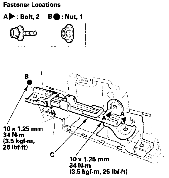 Remove the bolts (A) and nut (B), then remove the seat striker (C).