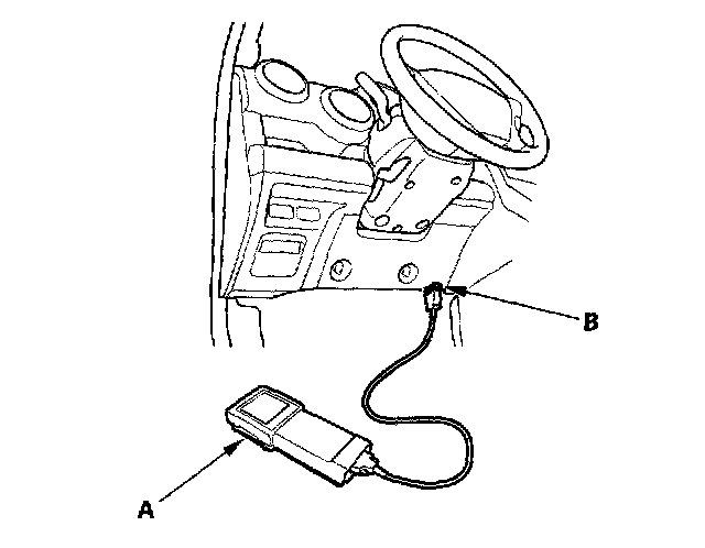 1. With the ignition switch OFF, connect the Honda PGM Tester or HDS (A) to the 16P Data Link Connector (DLC) (B) under the right side of the dashboard.