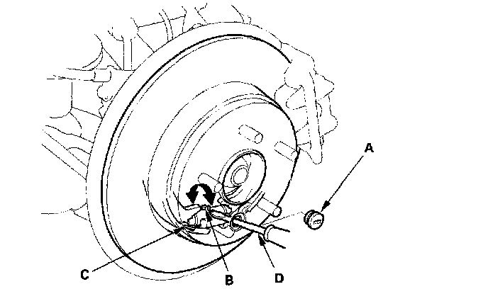 7. Turn the ratchet teeth (B) on the adjuster assembly (C) with a flat-tip screwdriver (D) until the shoes lock against the drum. Then back off the adjuster eight clicks, and install the access plug.