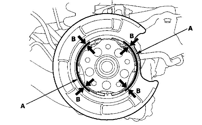 4. Measure the parking brake lining thickness (B). Measurement does not include brake shoe thickness.