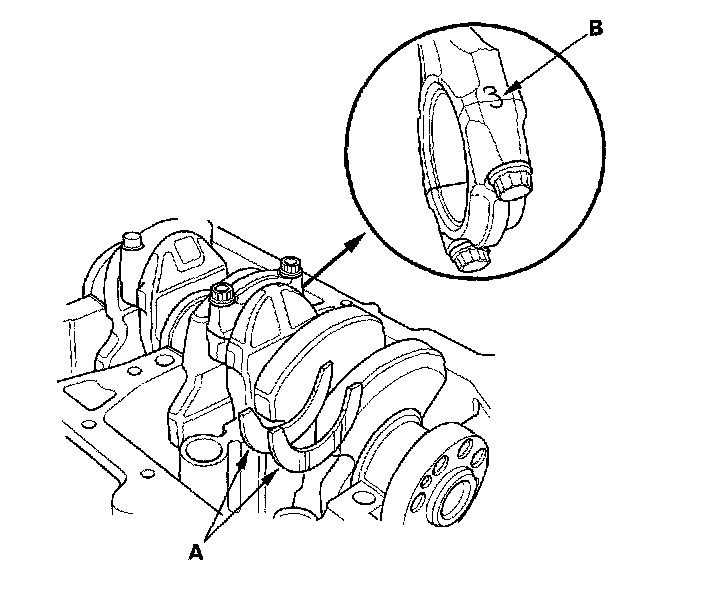10. Seat the rod journals into connecting rod No. 1 and connecting rod No. 4. Line up the mark (B) on the connecting rod and cap, then install the caps and bolts finger-tight.