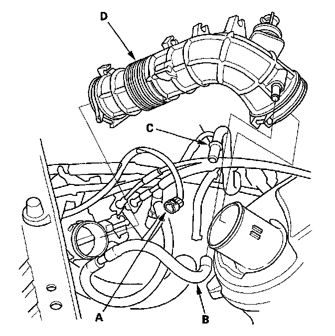 4. Remove the vacuum hose (B) and breather pipe (C), then remove the intake air duct (D).