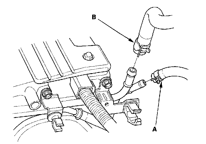 8. Remove the Evaporative Emission (EVAP) canister hose (A) and brake booster vacuum hose (B).