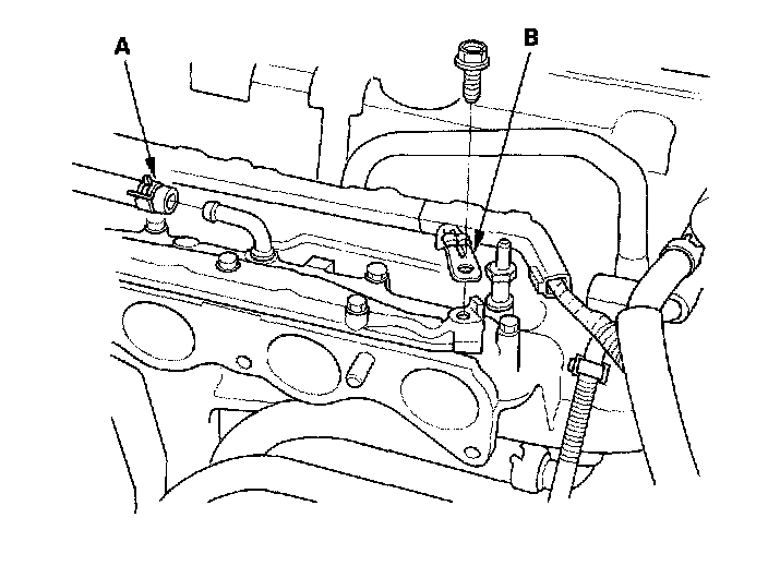 11. Remove the positive crankcase ventilation (PCV) hose (A) and ground cable (B).