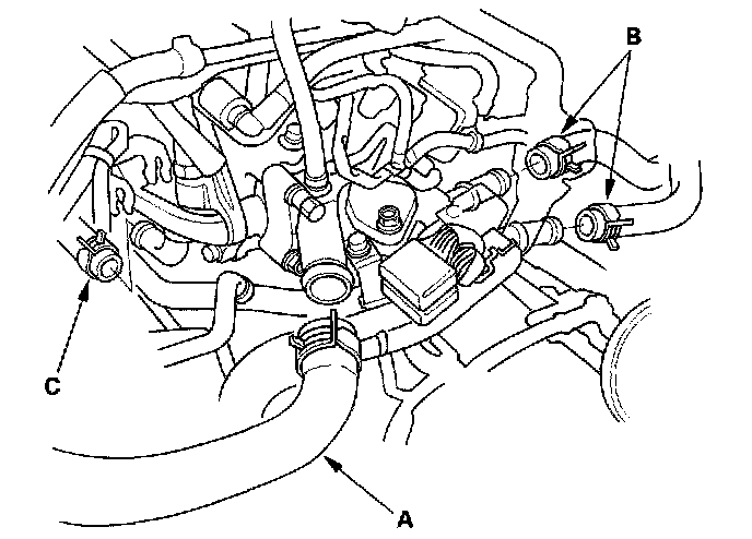 12. Remove the upper radiator hose (A), heater hoses (B) and water bypass hose (C).